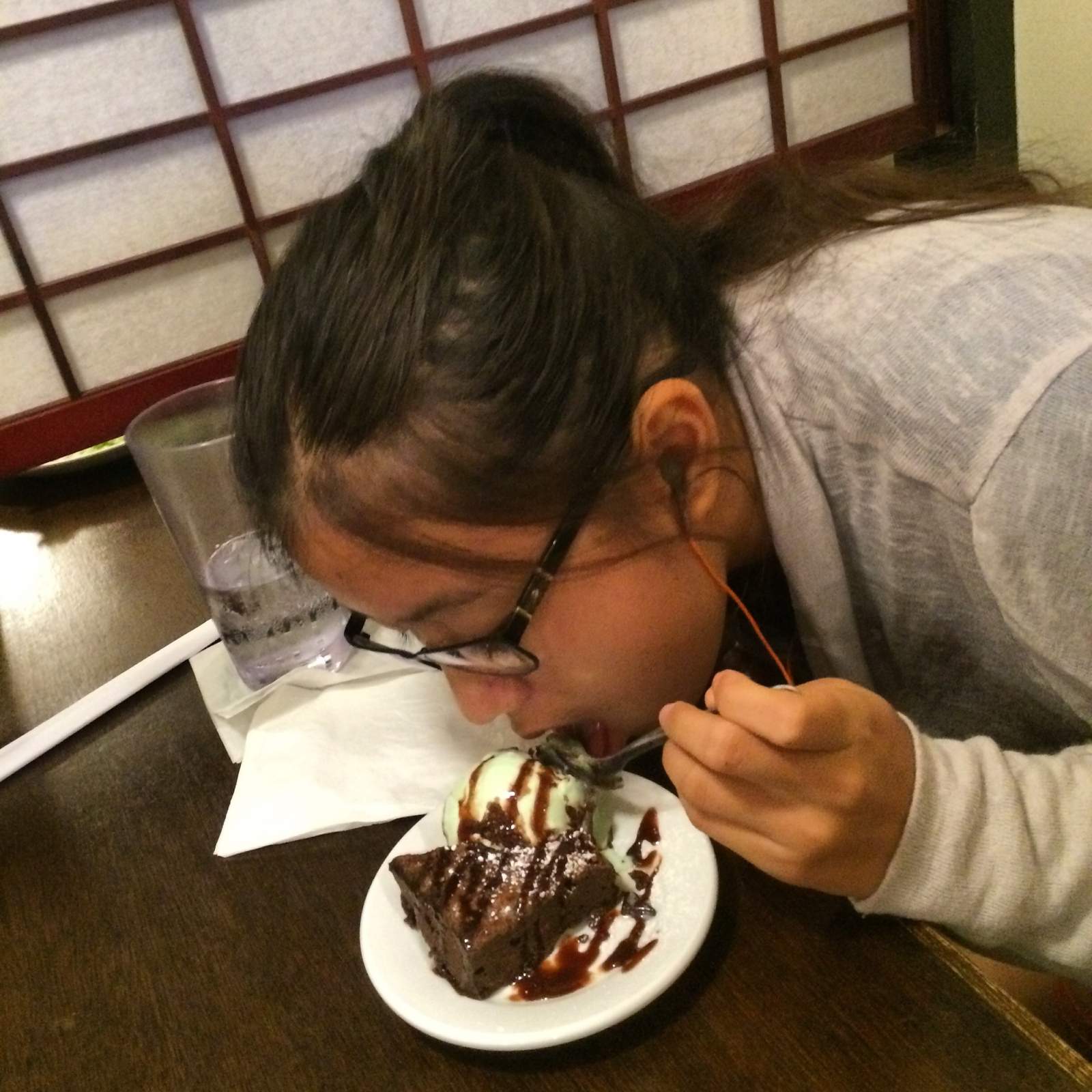Monkey's dessert focus - brownie a la mode with mint chip ice cream