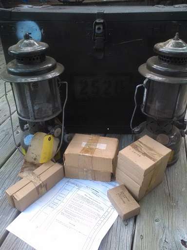 Marine Corps Stock List SL-3-00402A, Lantern Set, Gasoline. NSN 6260-00-669-6636 Kit Box Channel, Globe BX 2 Chest EA 1 Funnel EA 1 Lantern EA 2 Mantle