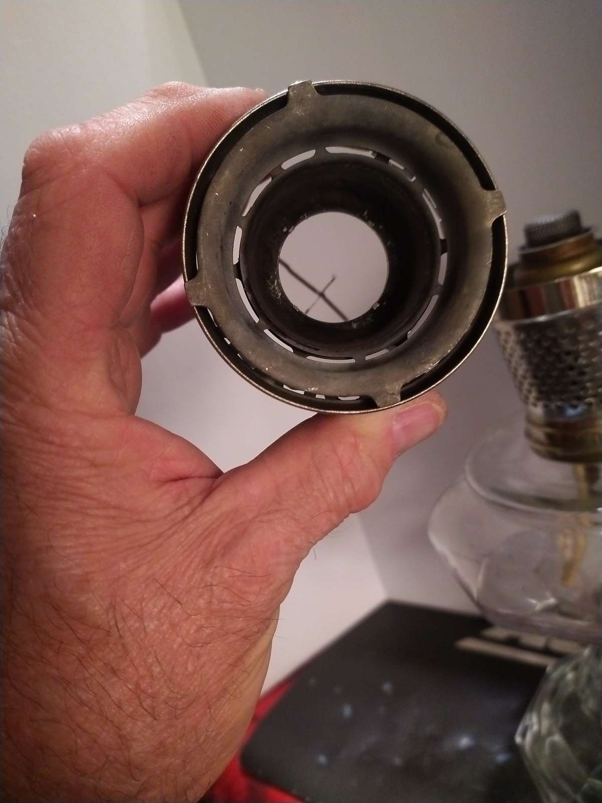 This is set up with 1/4" standoff from the globe. With a little experimenting on my prototype I got it to hug the cage around the globe and lock on around the two cage legs on each side. The shield can then be collapsed with the lamp