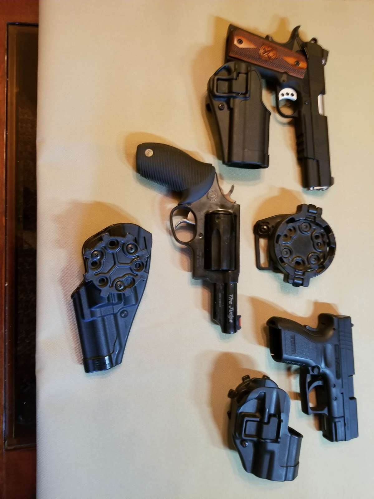 Springfield Lightweight Operator .45 ACP, Springfield XD Sub-Compact 9mm and Taurus Judge #000 .410 shot shells.