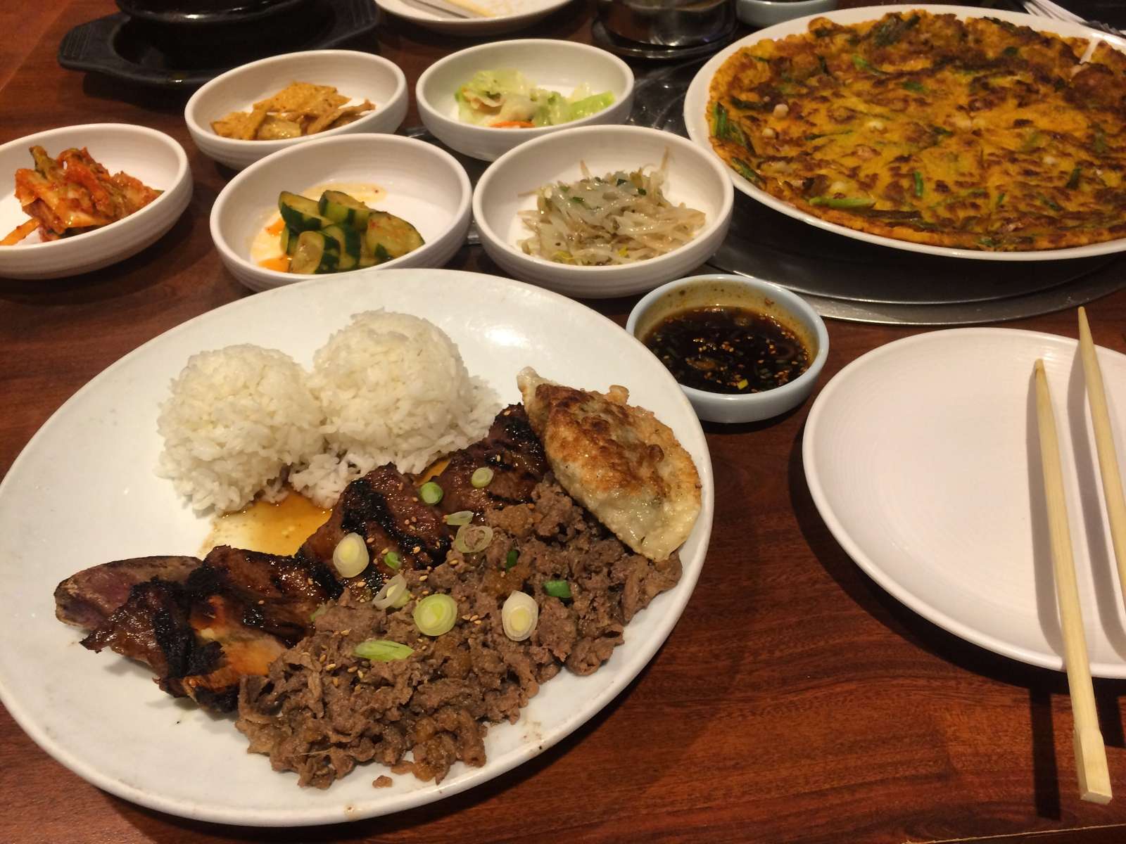 Kalbi, bulgogi and seafood pancake