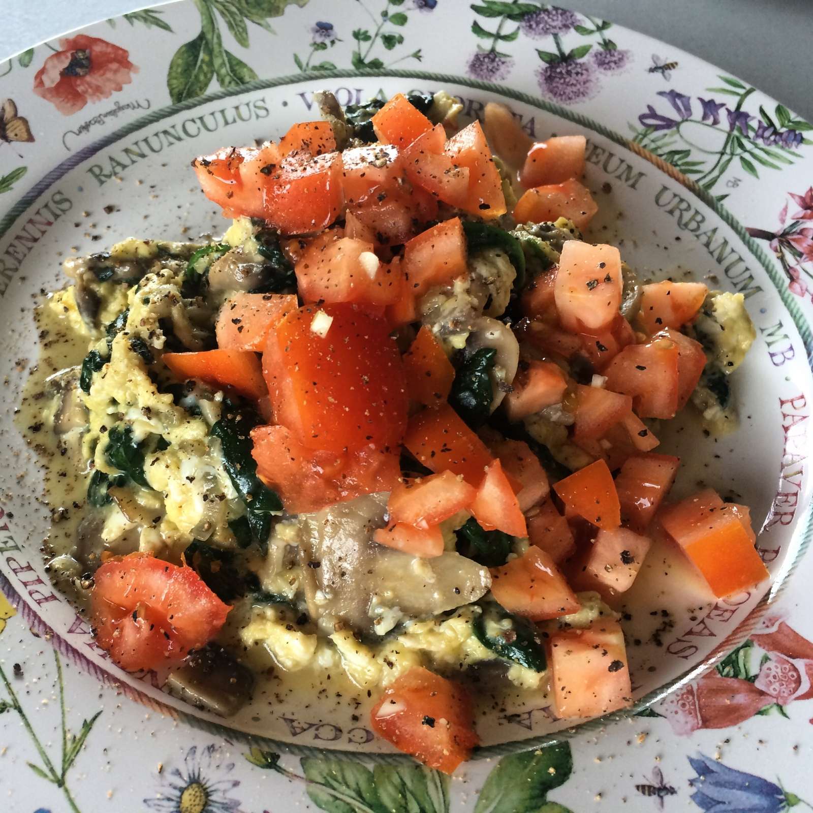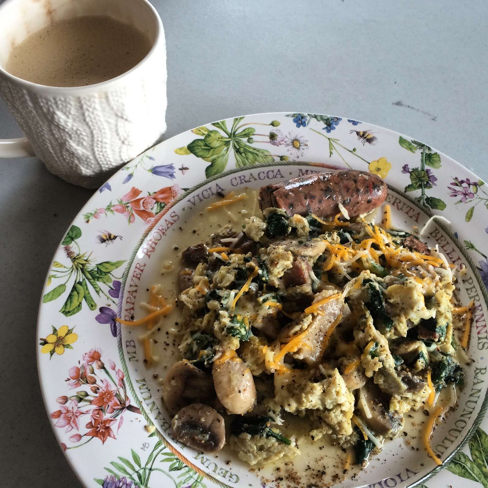 Wifee wanted a three egg veggie scramble with lots of mushrooms, spinach and tomatoes. I wisely substituted the tomatoes in mine to a more healthy sausage and cheese. #scrambled #eggs #garlic #shallots #mushrooms #spinach #tomato #sausage #cheese #weresofull