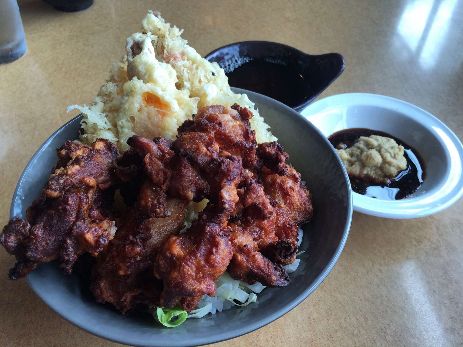 Tempura and mochiko chicken donburi
