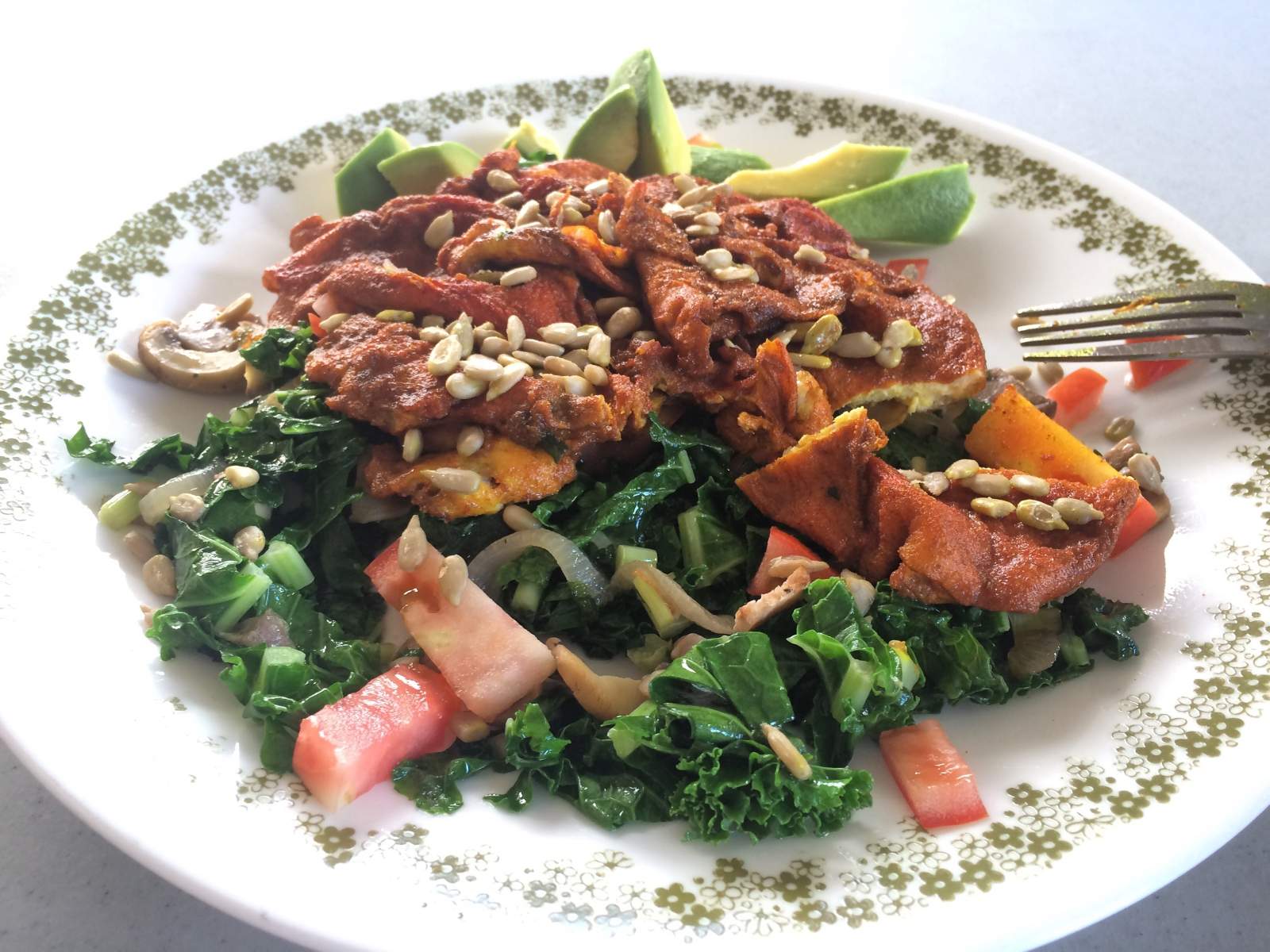 Curried eggs on veggies with avocado