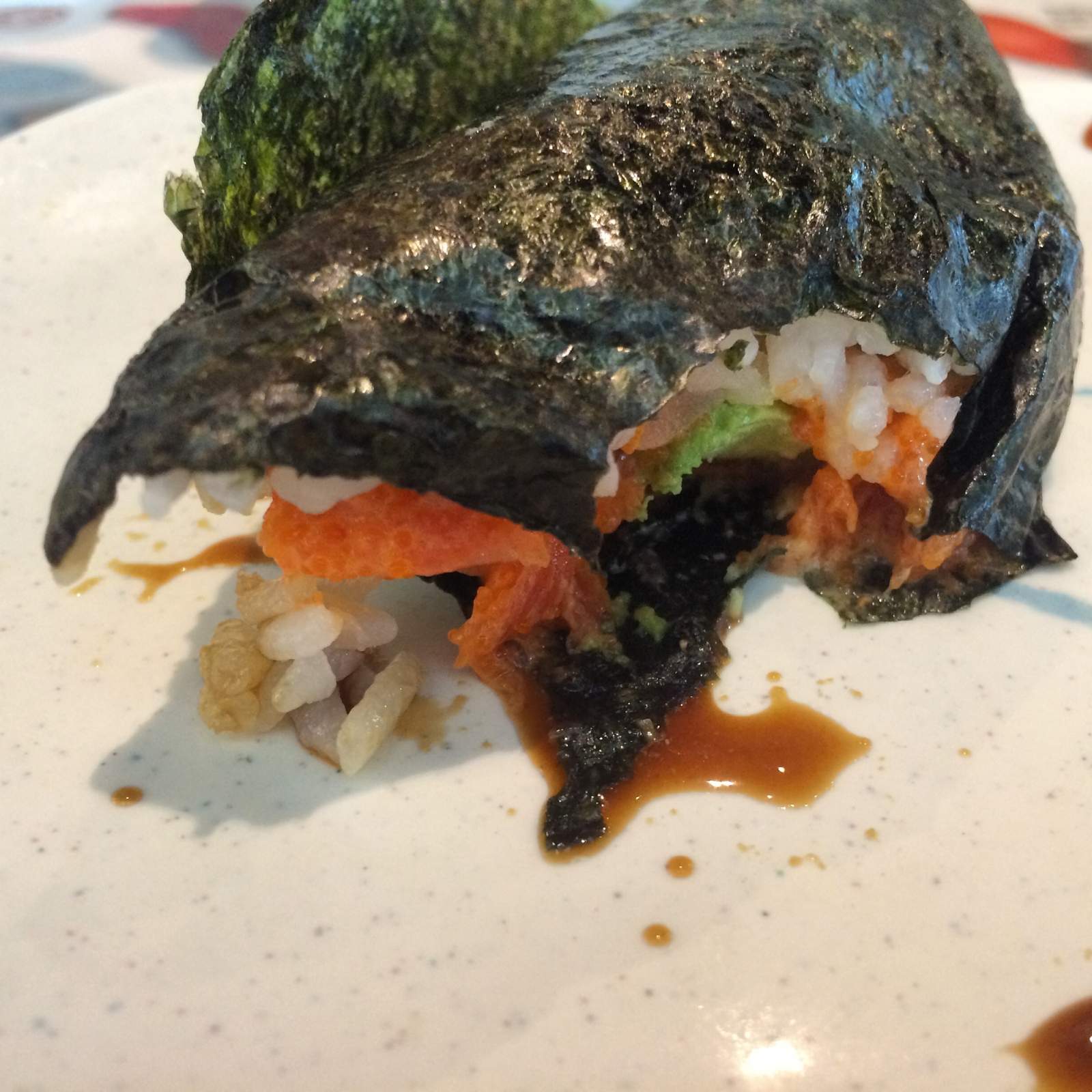 Half eaten spicy tuna handroll