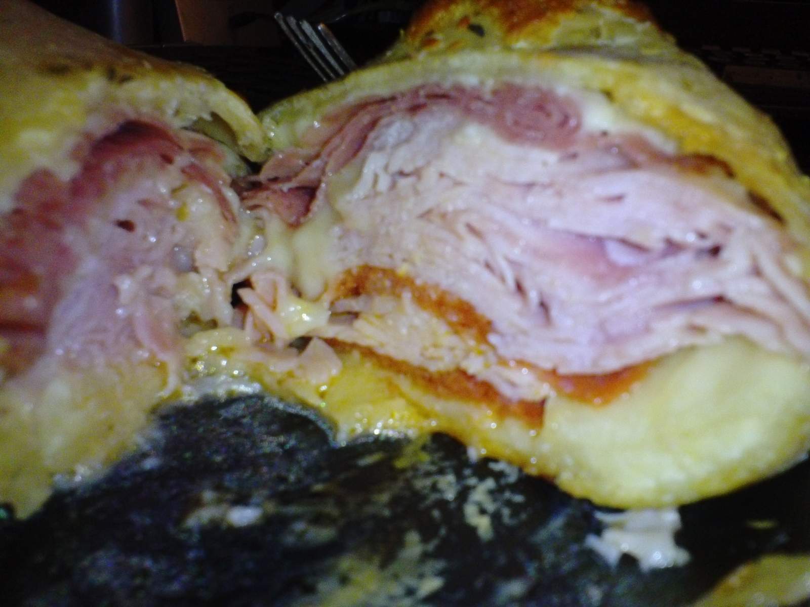 Ham, cheese, pepperoni, goodness. Stuffed FULL of meats. Hah, that's what she said.