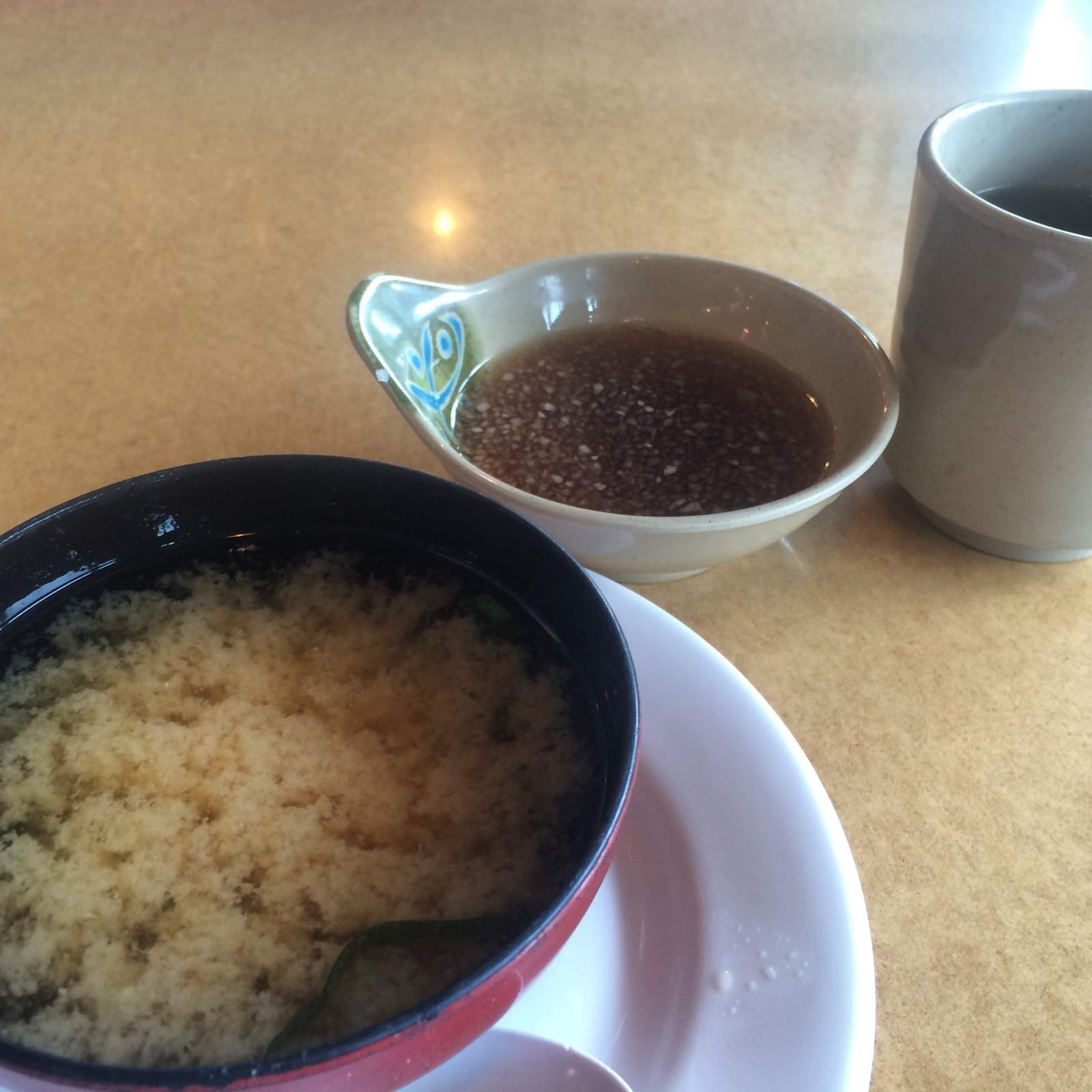 Miso soup, tempura sauce and green tea