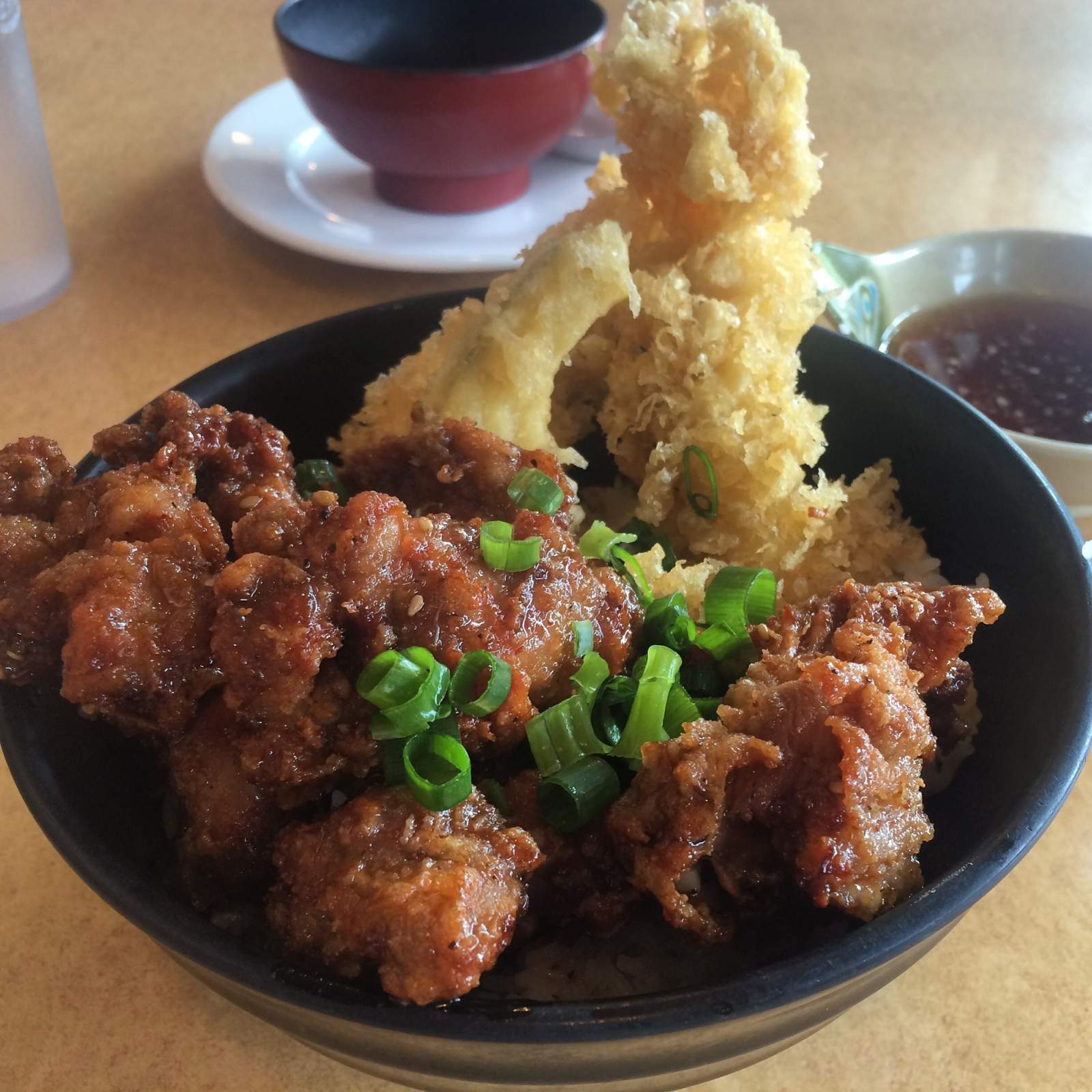Shrimp & veggie tempura and Korean Chicken donburi