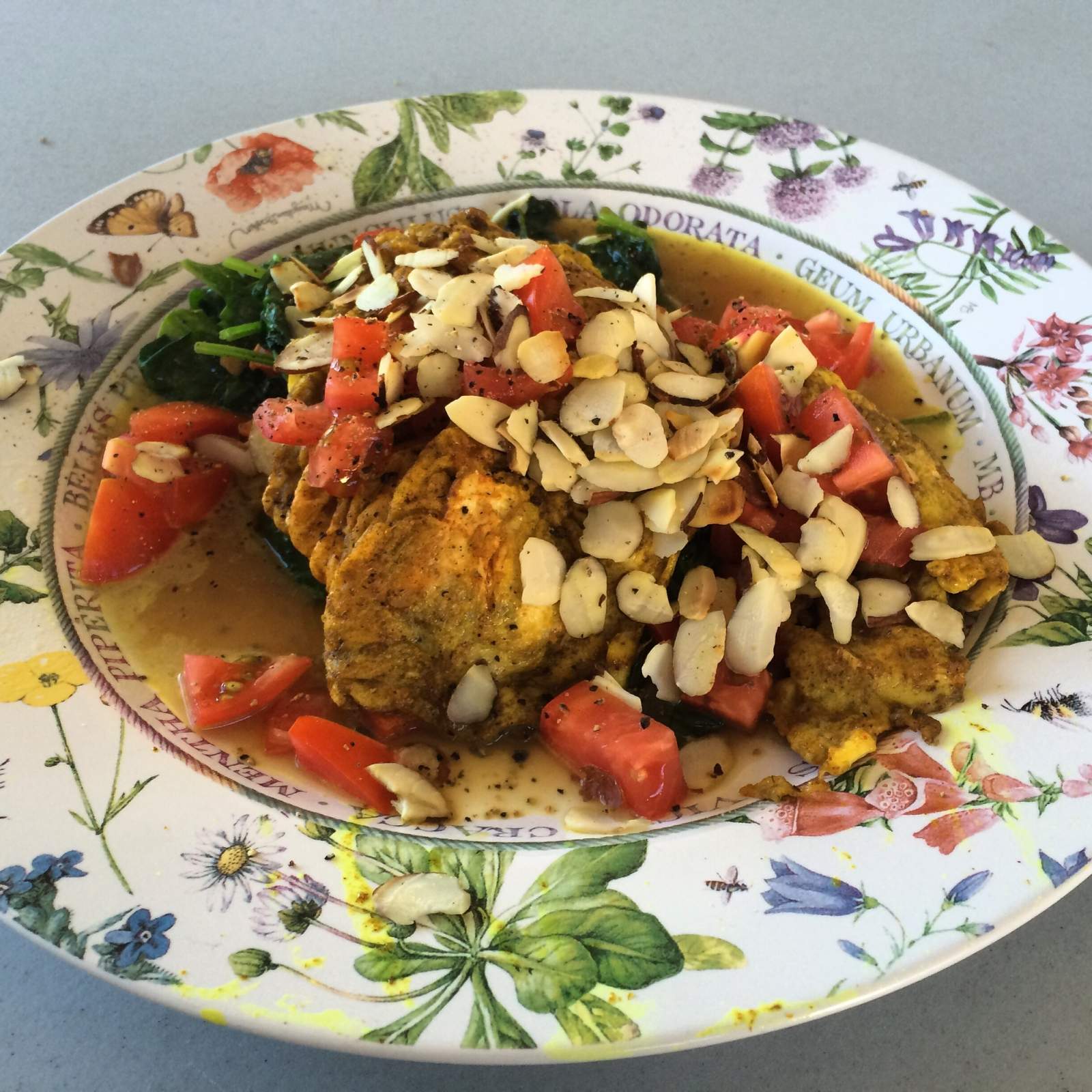 curried eggs on veggies topped with nuts