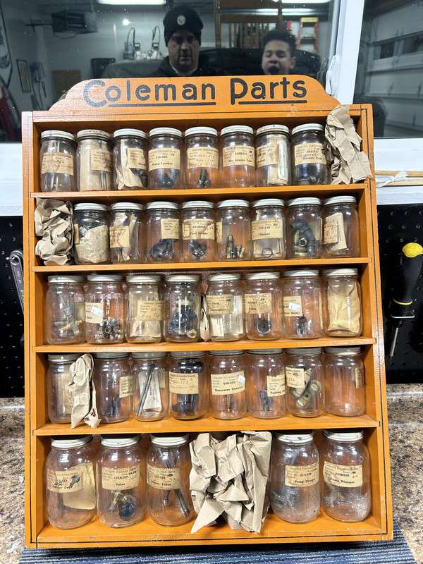 Coleman parts cabinets and parts jars