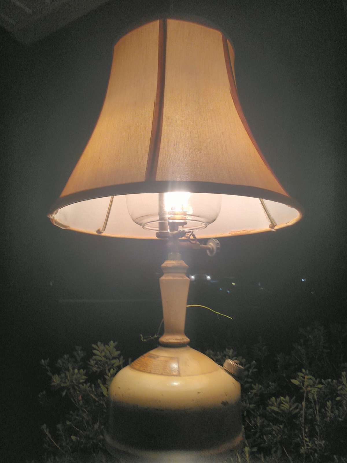 Coleman 152 on kerosene, and with preheat flame still visible through the 99 cent Goodwill shade. A true dual fuel running white gas or kerosene with a generator swap and preheat cup. Being nearly at sea level and 75 degrees I could've easily match preheated this kerosene generator tonight.