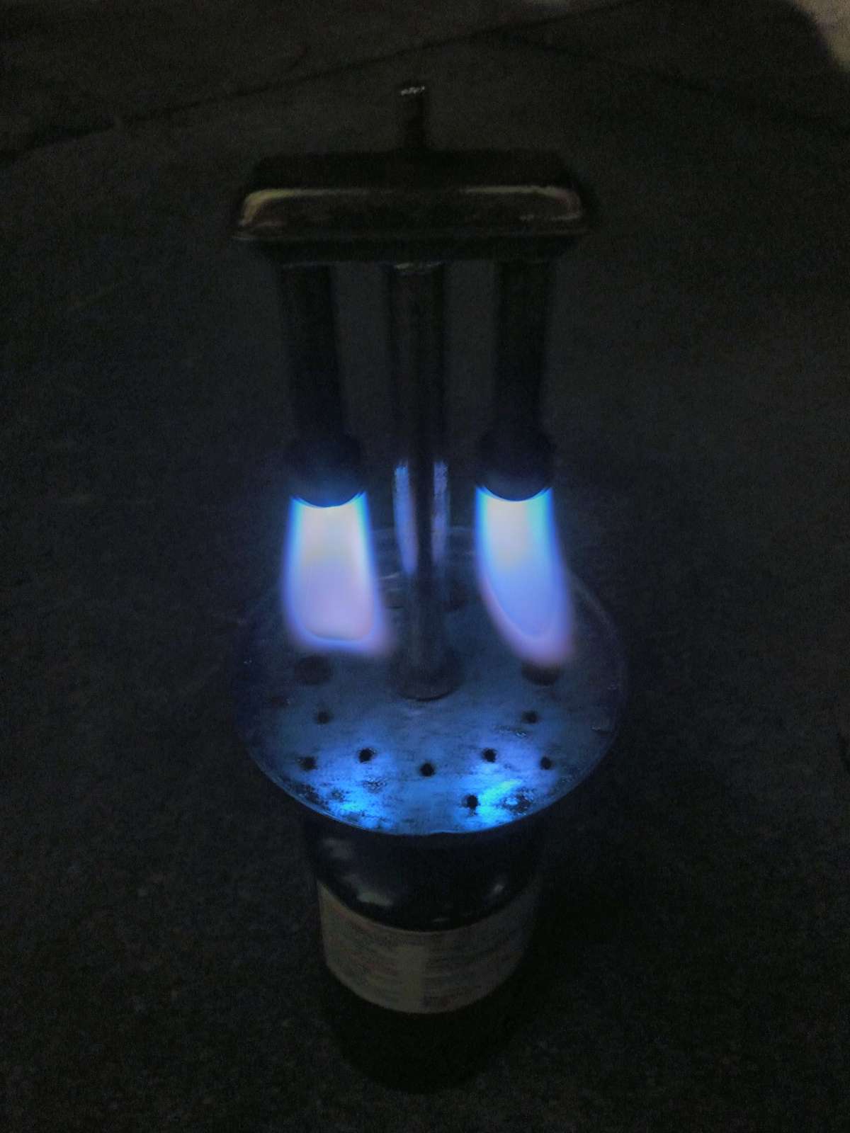 Q99 generator had been run on gasoline. Old gas drained, refilled with Camp Fuel. I heated the generator before tying on the mantles and watched the naked burners blast out dual gray jets of smoke, like a snort from an angry dragon, before the gasses burst into flame. This one I'll name Puff.