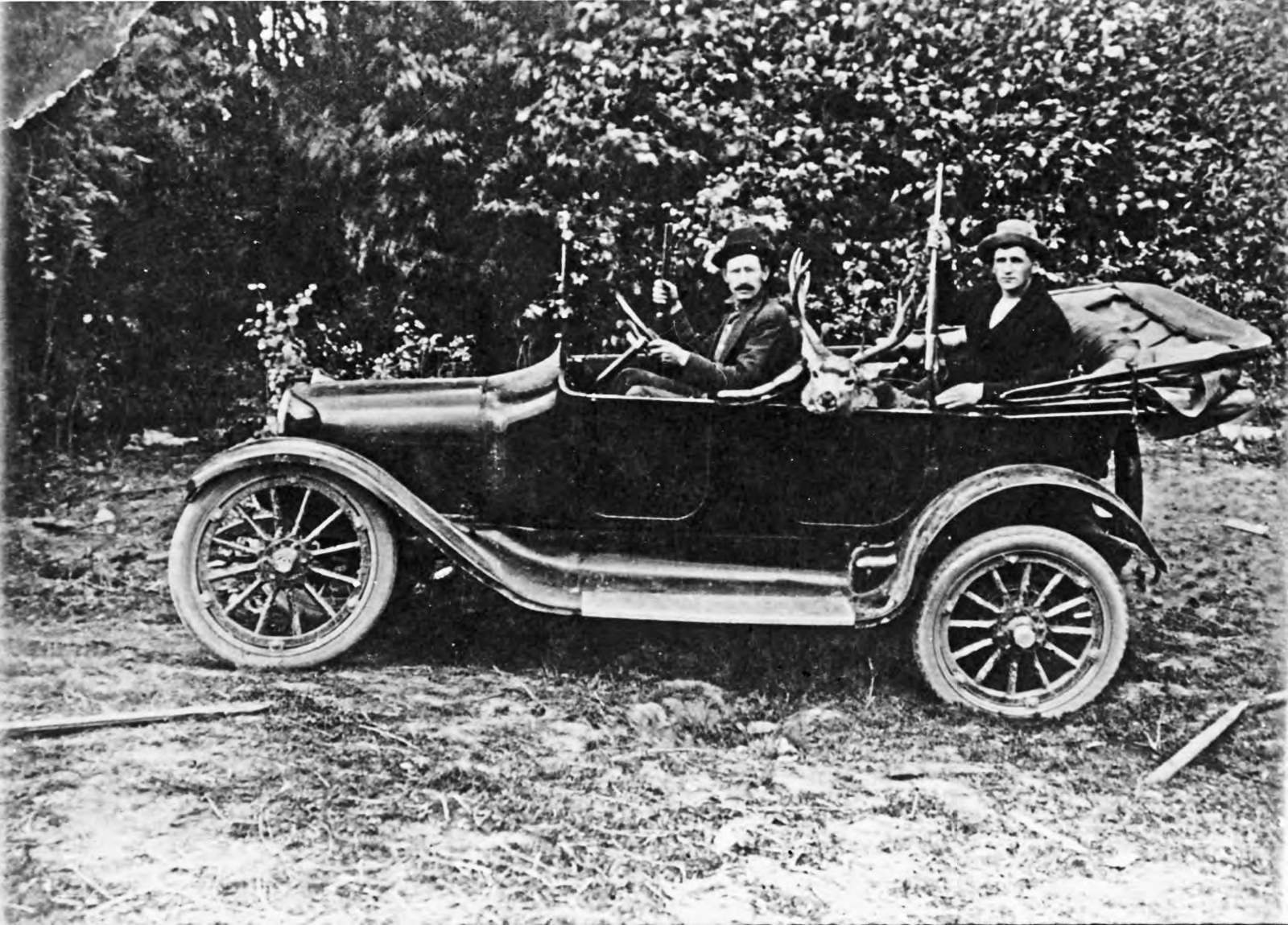 Two local hunters pose in their open automobile with a large buck deer that one of them had just shot. The rack of antlers on this deer would be a trophy for any hunter. The hunters proudly display their rifles. circa 1920