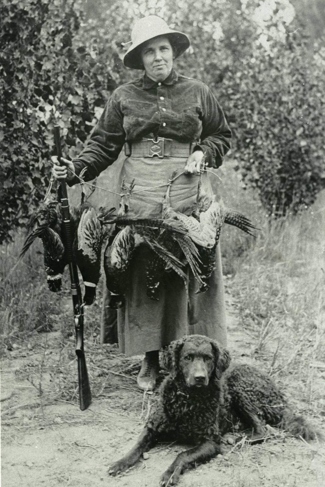 Ellen Pautzke poses with the pheasants that she has killed in a successful hunt. In her right hand she holds her rifle. The pheasants are hung by a string that she holds in both hands. At her feet lays her hunting dog.
