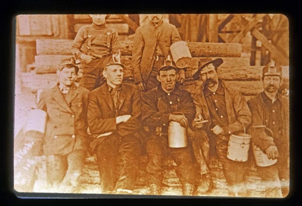 Unidentified miners with lights and lunch buckets dating to 1900 or after, due to the miners' use of coal oil lamps. This photo is in the book "Coal Towns in the Cascades" by John C. Shideler, where the men are identified as Cle Elum miners.
