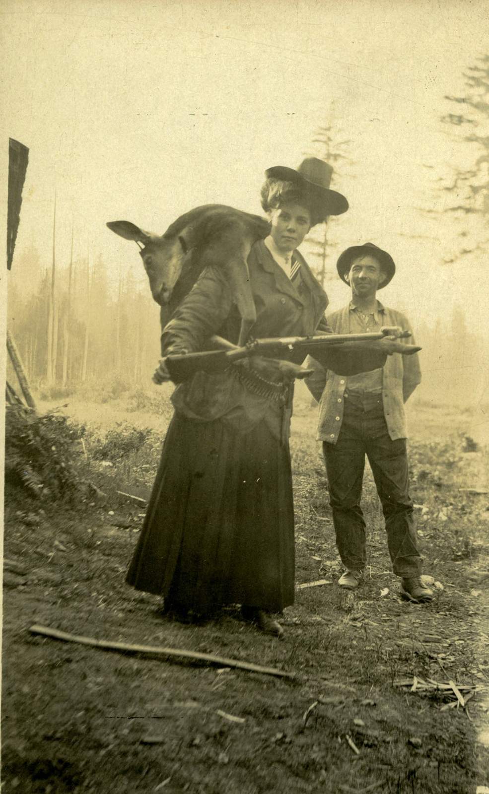 A woman wearing a hat, dress, and bullet belt carries a dead deer on her back and her rifle in front of her, propped on the legs of the deer. A man stands to her side, slightly behind her, with his hands behind his back.