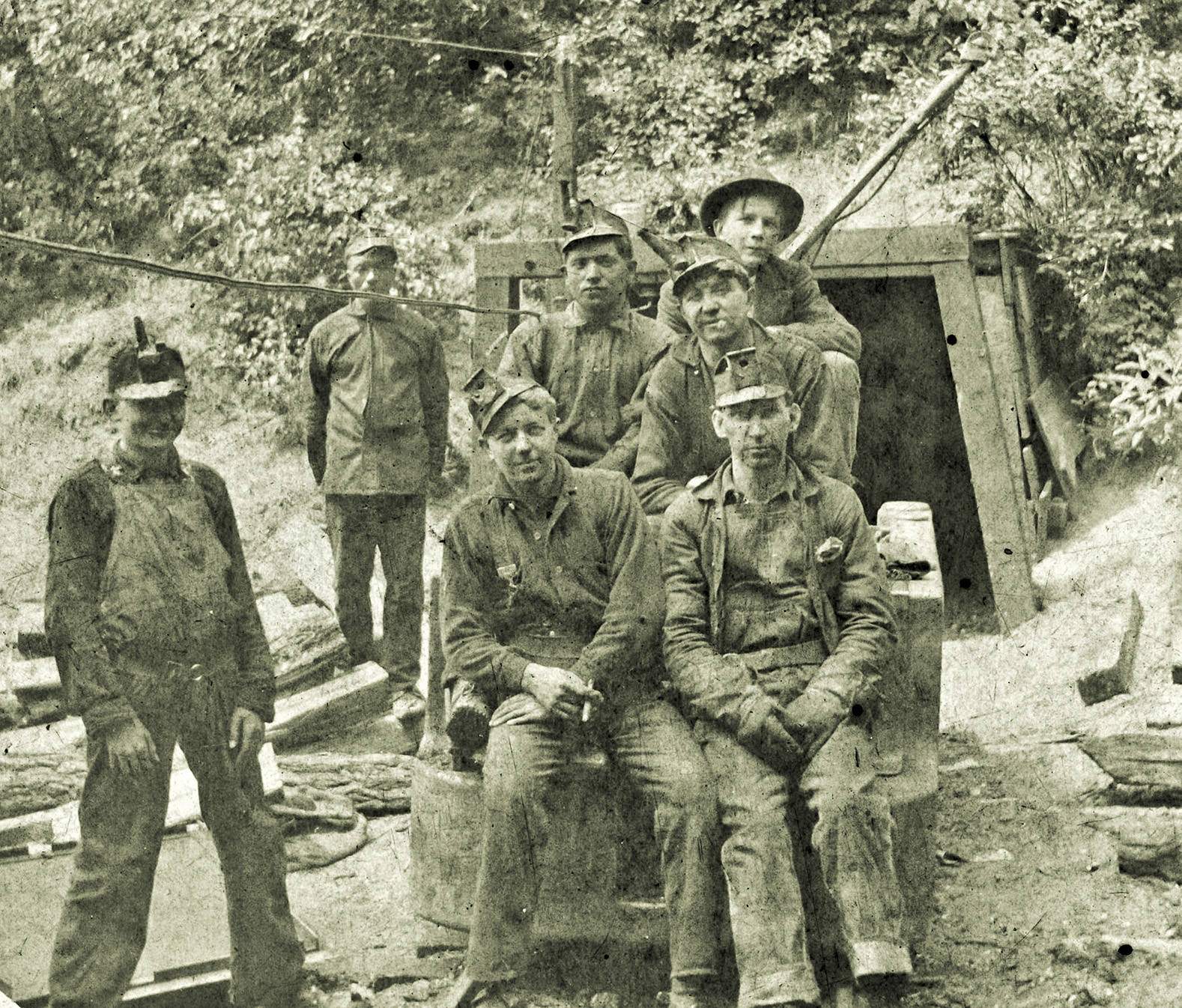 Seven unidentified miners sit on a man trip at the entrance of N.W.I.Co.'s No. 3 Mine in Ronald.