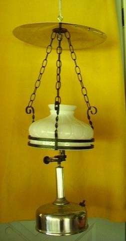 Shade stays in place, lamp is positioned under it. Makes clean up a snap and leaves the whole table open for use during the day.